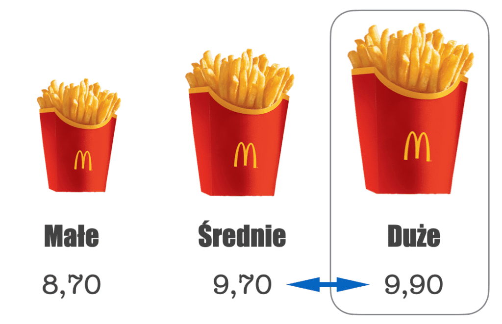 Jak myślisz, które frytki ludzie wybierają najczęściej? Oczywiście duże. Bo kto normalny kupiłby średnie, skoro można mieć duże dopłacając tylko 20 groszy? A więc cena średnich frytek jest zawyżona, aby ludzie płacili 9,90 zł.